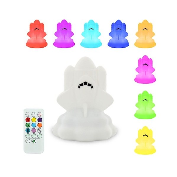 Hormis en blanc, elle s'éclaire de 8 autres couleurs au choix que l'on peut changer soit en touchant la veilleuse, soit avec la petite télécommande fournie. La télécommande permet également de régler l'intensité lumineuse , mais également la minuterie, si nécessaire, pour que la veilleuse s'éteigne d'elle même près 15, 30 ou 60 minutes.